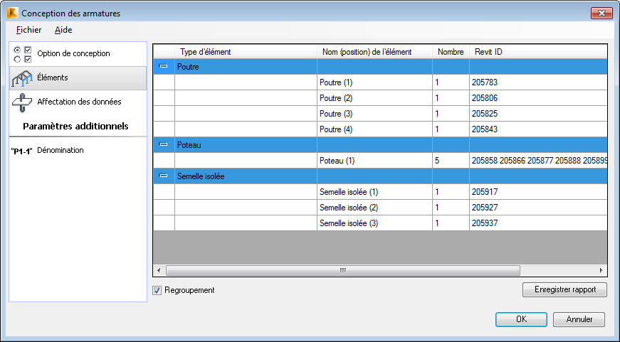 L'onglet Eléments affiche la liste des éléments sélectionnés et pris en charge par le module (poutres en béton, colonnes et semelles isolées). Les éléments sont regroupés en fonction de leur type (trois groupes principaux : les poutres, les poteaux et les semelles isolées), du paramètre Mark pour une instance de la famille Revit, de la géométrie de l'élément (longueur, forme de la section et cotes) et des paramètres d'armature. Vous pouvez également désélectionner l'option Regroupement. Tous les éléments sont alors considérés séparément et le nombre de projets BA Robot est égal au nombre d'éléments sélectionnés dans Revit.