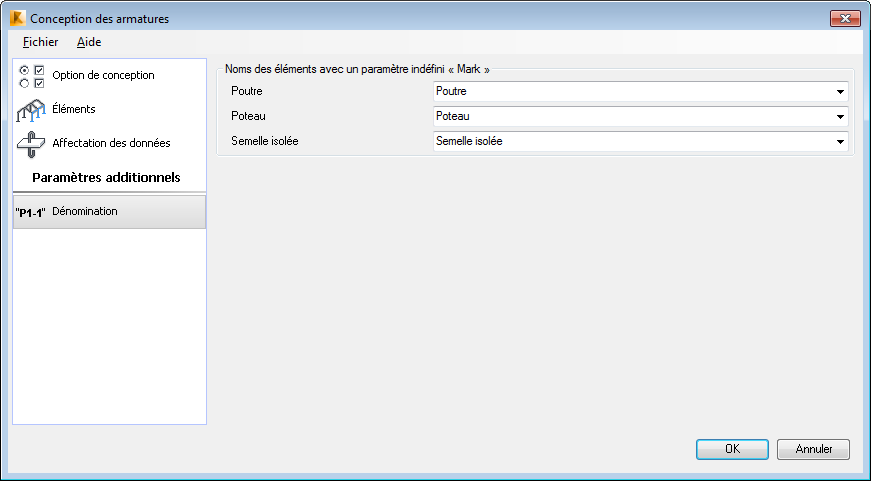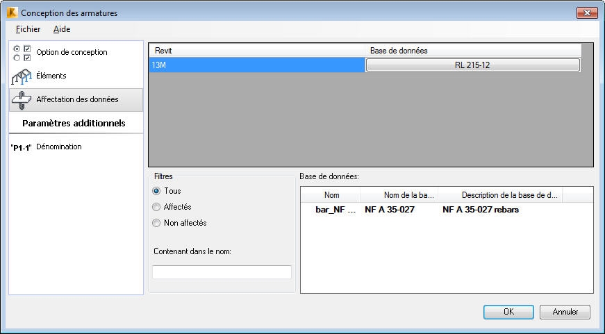 Pour changer la barre d'armature affectée, il faut cliquer sur le bouton se trouvant dans la colonne droite du tableau ; une autre boîte de dialogue de sélection s'affiche dans laquelle vous devez sélectionner la barre à affecter dans la base de données.