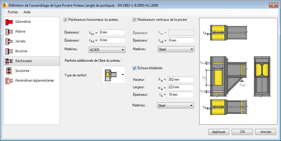 L'onglet Raidisseurs contient les options permettant de définir les raidisseurs verticaux de la poutre et horizontaux du poteau.