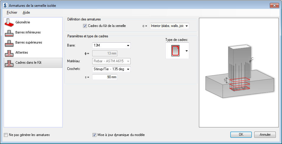 Pour générer une armature de cadre, sélectionnez Cadres du fût de la semelle sous la définition des armatures. Vous pouvez ensuite définir les paramètres du cadre :
