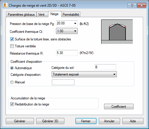 - Le champ Accumulation de la neige contient l’option Redistribution de la neige et permet de générer les charges de neige avec la prise en compte de l’évacuation de la neige des toitures inclinées, redistribution de la neige par l’action du vent, accumulation de la neige par la présence d’obstacles sur la toiture (chenaux, acrotères) ; Par défaut, les charges de neige sont générées avec prise en compte de la redistribution de la neige sur les toitures.