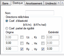 La définition du relâchement consiste à définir le nom du relâchement et les directions des relâchements pour l’origine et l’extrémité de la barre, de plus il faut définir les valeurs des coefficients d’élasticité :