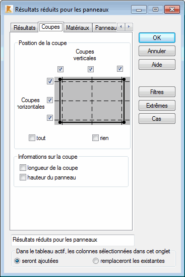 Sélectionnez l'onglet Coupes dans la boîte de dialogue Poteaux pour définir l'emplacement des coupes et calculer des valeurs réduites.