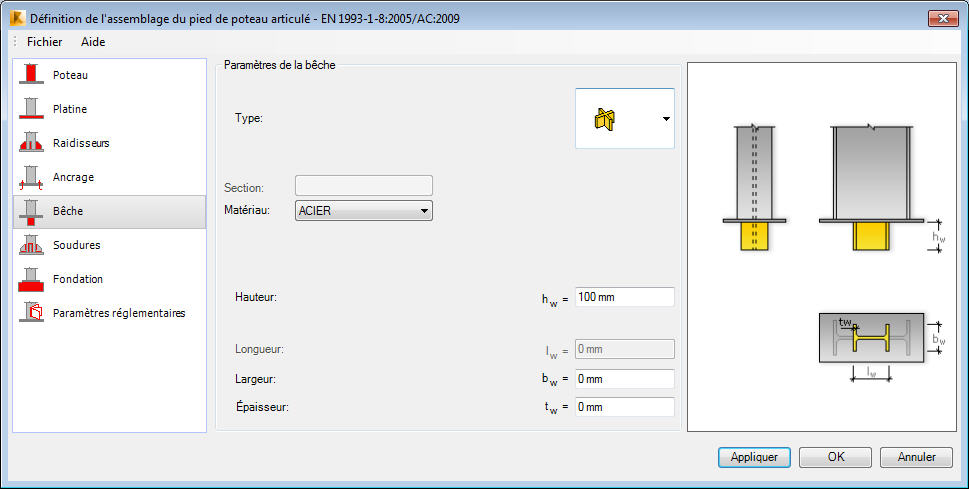 Les options disponibles sur l'onglet Bêche permettent de définir les paramètres de la bêche renforçant l'assemblage en cisaillement.