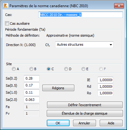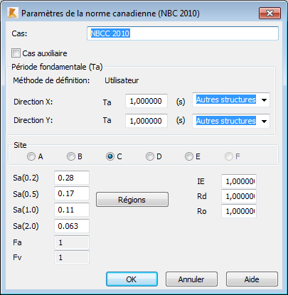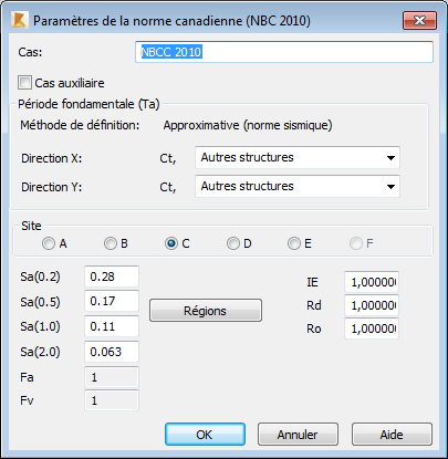 Les paramètres réglementaires de l'analyse sismique selon la norme NBC 2010 sont définis de la façon suivante :