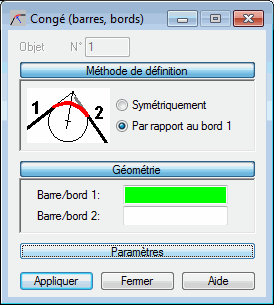 - définition graphique : cliquez dans le champ Barre/bord 1 et sélectionnez la première barre/le premier bord ; définissez de la même façon la deuxième barre/le deuxième bord et le rayon (si la méthode Symétriquement a été sélectionnée).