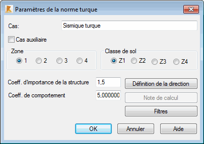 Les paramètres de l’analyse sismique des structures dépendent de la norme parasismique sélectionnée pour le calcul des structures sollicitées par des charges sismiques. Une fois que vous avez sélectionné la norme turque dans la boîte de dialogue Définition d'un nouveau cas ou cliqué sur le bouton Paramètres dans la boîte de dialogue Type d'analyse, la boîte de dialogue représentée ci-dessous s'affiche :
