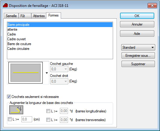 Boîte de dialogue Disposition d'armature - onglet Formes (semelle BA)