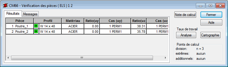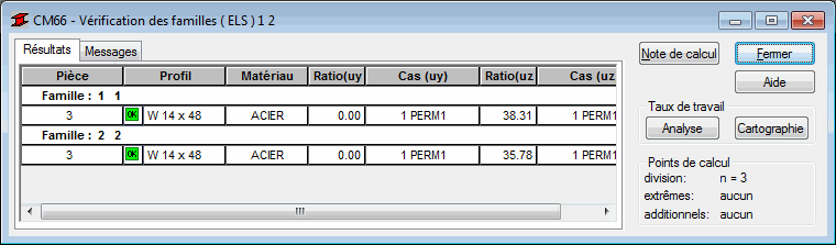 Une fois les calculs effectués, le logiciel affiche les résultats simplifiés pour le type de vérification sélectionné.