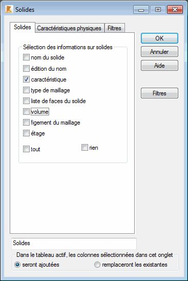 Vous pouvez sélectionner les grandeurs suivantes pour la présentation des solides.