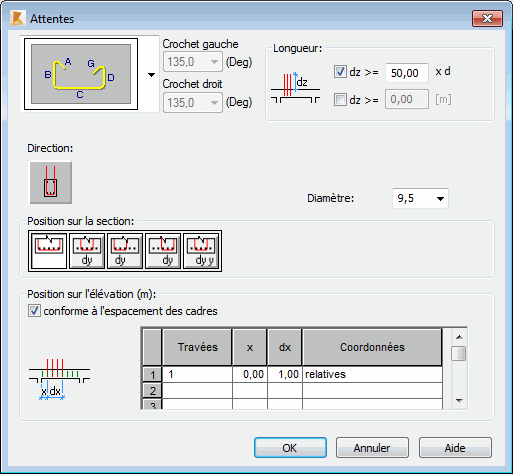Après un clic sur le bouton OK, les attentes sont générées suivant les données définies par l’utilisateur. Les aciers en question sont affichés dans la fenêtre graphique et dans le tableau des armatures.