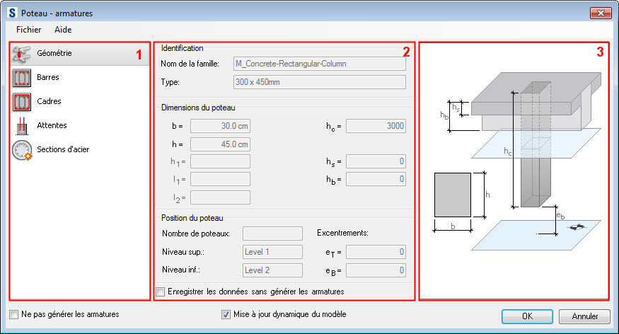 - A droite s'affiche une vue graphique du poteau BA défini et de son armature.