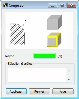 L’option sert à définir des arcs (congés) entre les arêtes des parois formant l’objet 3D. Cette option est accessible de l'une des manières suivantes :