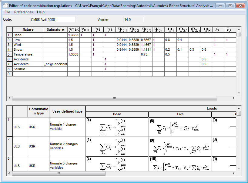 Une fois les valeurs de coefficient ou les formules de combinaison des règlements modifiées, le fichier de règlement modifié *.rgl peut être enregistré en sélectionnant Fichier > Enregistrer. Le fichier est enregistré par défaut dans le dossier de données de l'utilisateur (...\ Users \ your_login \ AppData \ Roaming \ Autodesk \ Structural \ Common Data \ version_number \...).