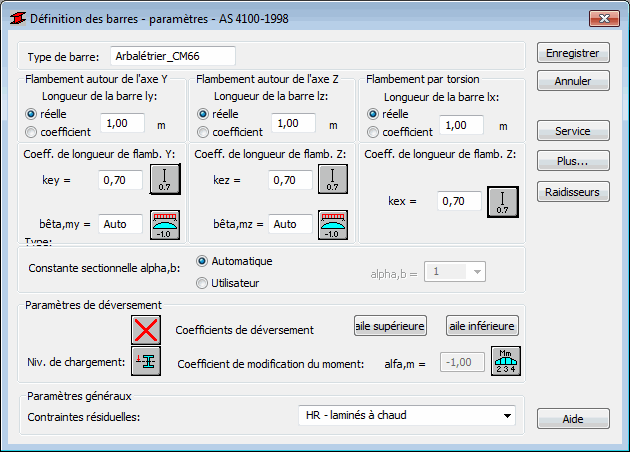La constante sectionnelle des barres permet de sélectionner la constante sectionnelle des barres alpha,b, qui détermine un coefficient de flambement. La valeur de la constante sectionnelle des barres peut être sélectionnée automatiquement, en fonction du type et de la classe de section.