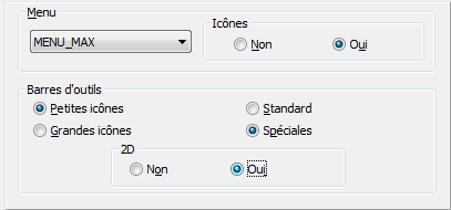 Vous pouvez sélectionner le type de menu dans le champ des menus. Vous pouvez décider si les icônes doivent être affichées à côté des commandes du menu.