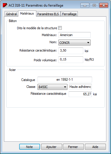 L'onglet Matériaux vous permet de définir les paramètres des matériaux de base pour les éléments de structure BA dimensionnés.