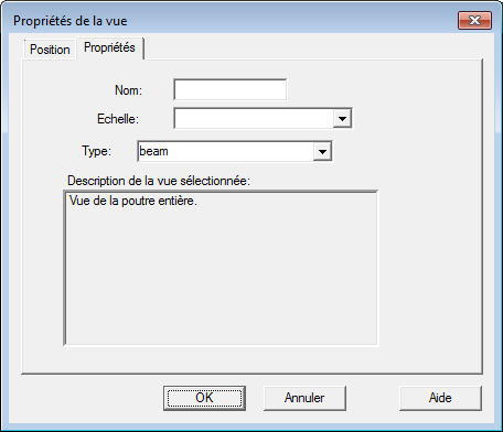 La boîte de dialogue Propriétés de la vue présentée ci-dessous permet de déterminer les paramètres de la vue. Elle peut être ouverte lorsque vous sélectionnez une vue précédemment définir et