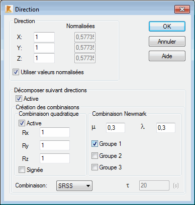 La résolution d’une force (sismique/spectrale) dans les directions génère trois cas sismiques se distinguant au niveau de la direction d’excitation. La direction de l’excitation (X,Y,Z) définie dans la partie supérieure de la boîte de dialogue est décomposée en (X,0,0) (0,Y,0), (0,0,Z) respectivement pour le cas en direction X, Y, Z. Les noms de nouveaux cas créés contiennent les informations sur la direction dans laquelle l’excitation est définie. De ce fait, les valeurs définies dans les champs X, Y, Z sont des valeurs du vecteur d’excitation. Sélectionnez l'option Utiliser valeurs normalisées : les valeurs des composantes sont ajustées de façon à ce que le vecteur soit un vecteur unitaire.