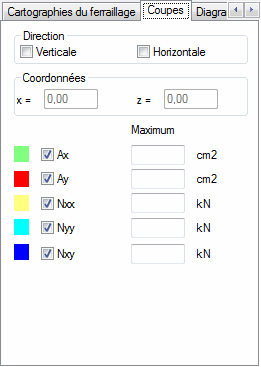 Dans la partie supérieure de l’onglet, vous pouvez sélectionner la direction de la coupe (verticale ou horizontale) et la valeur qui sera présentée sur la coupe. Les valeurs disponibles sont : armature dans la direction X ou Y (horizontal et vertical) désigné avec les symboles Ax et Ay et les efforts internes dans les directions X et Y (horizontales et verticales), et les tangentes XY désignées respectivement Nxx, Nyy et Nxy.
