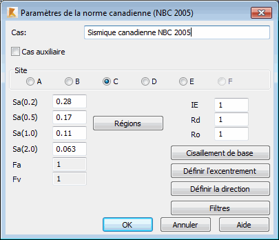 Les paramètres de l’analyse sismique des structures dépendent de la norme parasismique sélectionnée pour le calcul des structures sollicitées par des charges sismiques. Sélectionnez la norme sismique canadienne NBC 2005 dans la boîte de dialogue Définition d'un nouveau cas ou cliquez sur Paramètres dans la boîte de dialogue Type d'analyse.