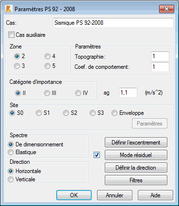 Les paramètres de l’analyse sismique des structures dépendent de la norme parasismique sélectionnée pour le calcul des structures sollicitées par des charges sismiques. Sélectionnez la norme sismique française PS 92 (mise à jour en 2008), dans la boîte de dialogue Définition d'un nouveau cas, ou cliquez sur Paramètres, dans la boîte de dialogue Type d'analyse.