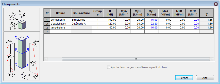 Remarque : L’option Ajouter les charges transférées à partir du haut est active seulement si le poteau supérieur a été défini.