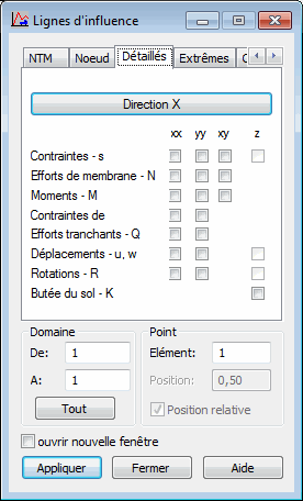 Les options disponibles dans la boîte de dialogue vous permettent d'indiquer une grandeur liée à la surface (définie pour une structure de type plaque ou coque) pour laquelle les lignes de l’influence seront présentées :
