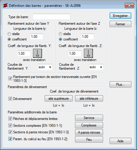 Dans le champ Coeff. de longueur de flamb., les coefficients de longueur de flambement de la barre dans les deux directions. Le logiciel propose automatiquement la longueur réelle de la barre (ou, éventuellement, la longueur totale des barres composantes).