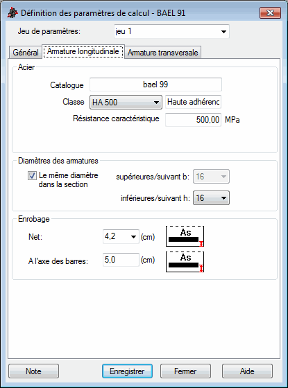 Onglet Armature longitudinale de la boîte de dialogue Définition des paramètres de calcul pour la norme BAEL :