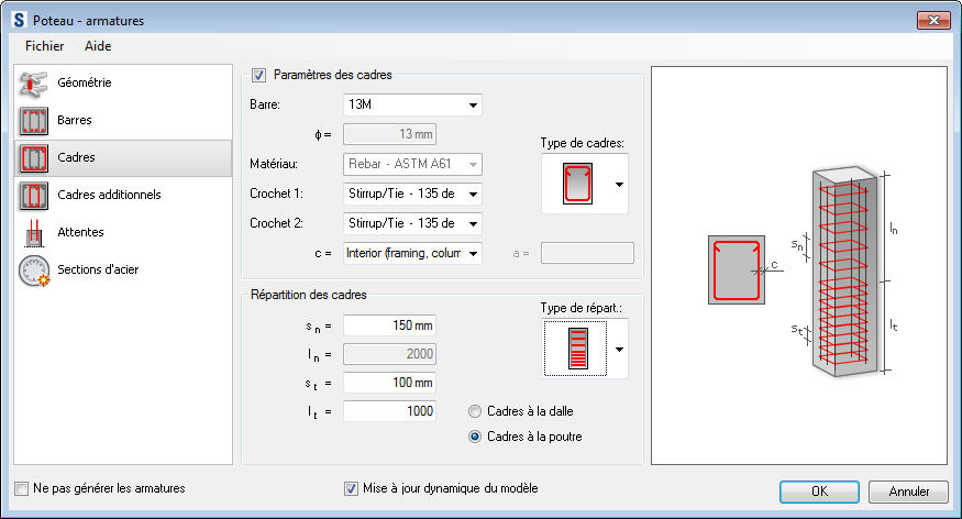 Il existe plusieurs paramètres d'armatures transversales (cadres) définies dans la boîte de dialogue des armatures de poteaux :