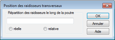- Entrez les coordonnées des raidisseurs transversaux le long de la poutre et spécifiez s'il s'agit de coordonnées réelles ou relatives à la longueur de la poutre.