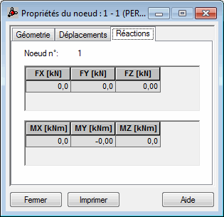 Outre le numéro de nœud, l'onglet affiche les valeurs de réactions (dans le repère global) calculées pour le nœud et le cas de charge sélectionnés. Les réactions sont présentées sous forme de tableau. Si la sélection active contient plus d'un cas, le tableau affiche les valeurs extrêmes des réactions.
