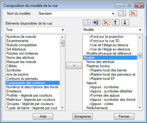 Les éléments disponibles de la vue contiennent toutes les catégories indiquées en bleu dans la boîte de dialogue Affichage. Cliquez sur > pour déplacer les catégories sélectionnées dans le panneau de droite contenant les paramètres du modèle actuellement défini/modifié. L'arborescence des groupes et des objets appartenant à des groupes individuels est créée dans le panneau de droite. Les éléments transférés du panneau gauche vers le panneau droit sont placés dans le groupe actuellement mis en surbrillance.