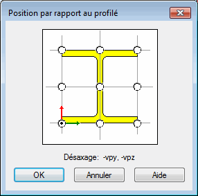 Dans cette boîte de dialogue, vous pouvez définir le décalage de l'axe longitudinal d'une barre par rapport aux dimensions transversales de la section. La sélection de la position de l'axe se fait par un clic sur la case d'option voulue disponible sur le schéma de la section. Au dessous du schéma de la section, le logiciel affiche la description de la position de la section de la barre, c'est-à-dire Position et caractéristiques de la position de la section qui est la valeur du désaxage dans le repère local :