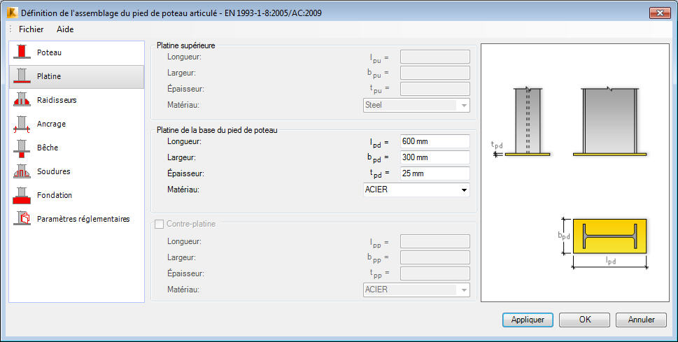 Sur l'onglet Platine, il est possible de définir les paramètres géométriques de base de l'assemblage :