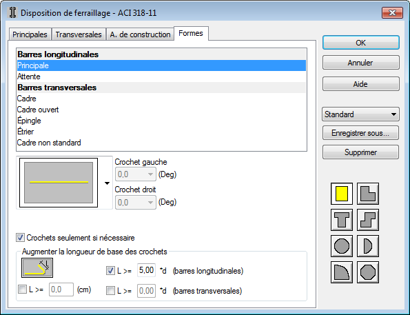 L'onglet Formes permet de sélectionner la forme des armatures longitudinales et transversales.