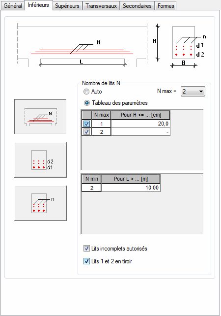 Si les aciers sont disposés en couches, les options affichées dans la zone Nombre de couches permettent de définir les critères de génération des armatures.