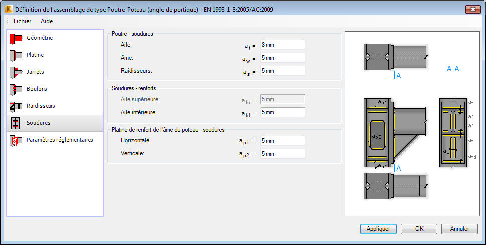 L'onglet Soudures contient les options permettant de définir l'épaisseur des soudures assemblant la poutre à la platine d'about et de celles assemblant les raidisseurs à la platine de renfort de l'âme du poteau.