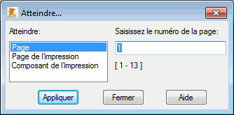 Dans le volet gauche, sélectionnez l'une des options suivantes : numéro de page, page de l'impression et composants d'impression. Dans le champ affiché à droite, saisissez le numéro de la page voulue ou sélectionnez le nom du composant voulu sélectionné dans la liste des composants de l’impression définie.