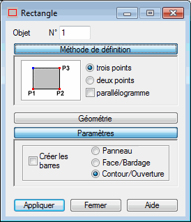 - Contour/Ouverture - Si cette option est cochée, le rectangle créé n’est qu’un contour, sans propriétés de panneau ni de bardage. Si ce contour se trouve à l’intérieur d’un panneau ou d’un autre contour, une ouverture est créée dans celui-ci. Par contre, si à ce contour on affecte :