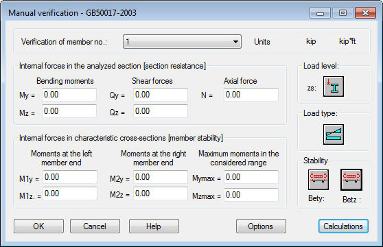 Les options disponibles dans la boîte de dialogue Vérification manuelle permettent la vérification des valeurs de force d'un élément en acier définies par l'utilisateur selon les exigences de la norme chinoise sur l'acier GB50017 - 2003. Cette boîte de dialogue est appelée par l'option de menu : Dimensionnement Dimensionnement des barres acier - options Vérification. La boîte de dialogue présentée ci-dessous s'affiche alors à l'écran.