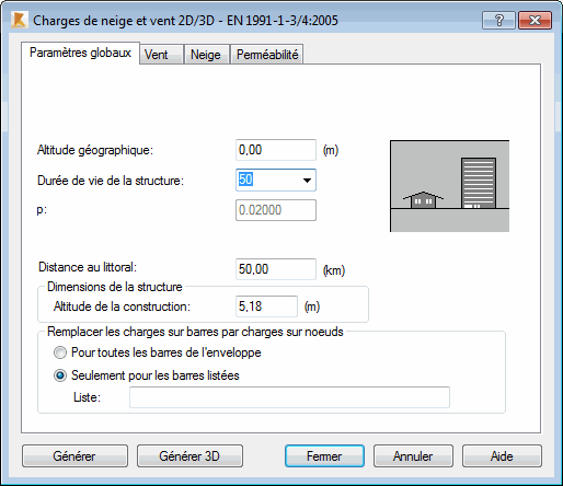 Après l'ouverture de la boîte de dialogue Charge de neige et vent et après un clic sur l'onglet Paramètres généraux, le logiciel affiche la boîte de dialogue suivante.