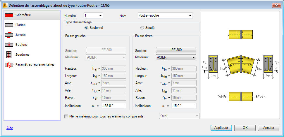 La partie centrale de la boîte de dialogue présente les paramètres géométriques et matériaux des poutres pour lesquels l'assemblage est créé.
