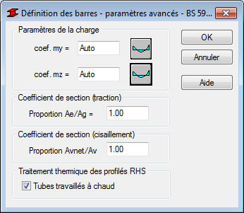 Cette option permet de définir des paramètres réglementaires supplémentaires du type de barre d'acier pour la norme britannique BS 5950:2000. Elle est disponible après un clic sur le bouton Plus affiché dans la boîte de dialogue Définition des barres - paramètres.
