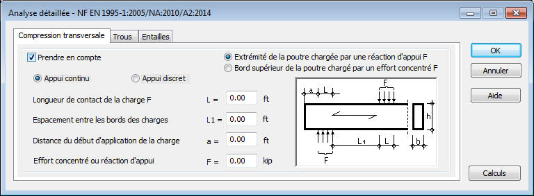 Les options disponibles dans cet onglet sont utilisées pour vérifier la résistance à la compression perpendiculaire à la nervure d'une poutre soumise à l'action d'un effort de compression F appliqué au bord inférieur ou supérieur d'une poutre.