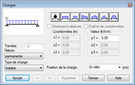 Le contenu de la partie gauche de la boîte de dialogue Charges varie en fonction du type de charge sélectionné. Elle affiche un schéma du type de charge concentrée, répartie ou surfacique sélectionné. Sur la droite se trouvent les icônes de sélection de charges.