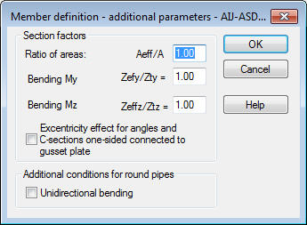 - coefficient de section (pour une section soumise à des efforts axiaux) : rapport An/A - l'option est utilisée pour définir le rapport de l'aire nette d'une section, incluant les trous de boulons, et l'aire brute d'une section. Ces données sont utilisées par le programme pour la vérification d'une barre en raison d'une traction conformément au point 6.2 de la norme