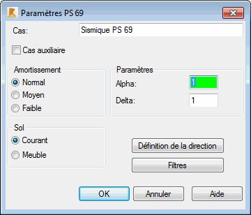 Les paramètres de l’analyse sismique des structures dépendent de la norme parasismique sélectionnée pour le calcul des structures sollicitées par des charges sismiques. Sélectionnez la norme sismique française PS69 (règles parasismiques 1969 - Révisées en 1982) dans la boîte de dialogue Définition d'un nouveau cas ou cliquez sur Paramètres dans la boîte de dialogue Type d'analyse.