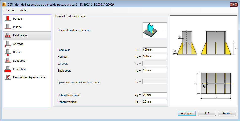 Les options disponibles sur l'onglet Raidisseurs permettent de définir les paramètres géométriques des raidisseurs du pied de poteau. Cet onglet est disponible, si sur l'onglet Poteau vous avez choisi un type de raidisseur quelconque (simple, avec tôle trapézoïdale).